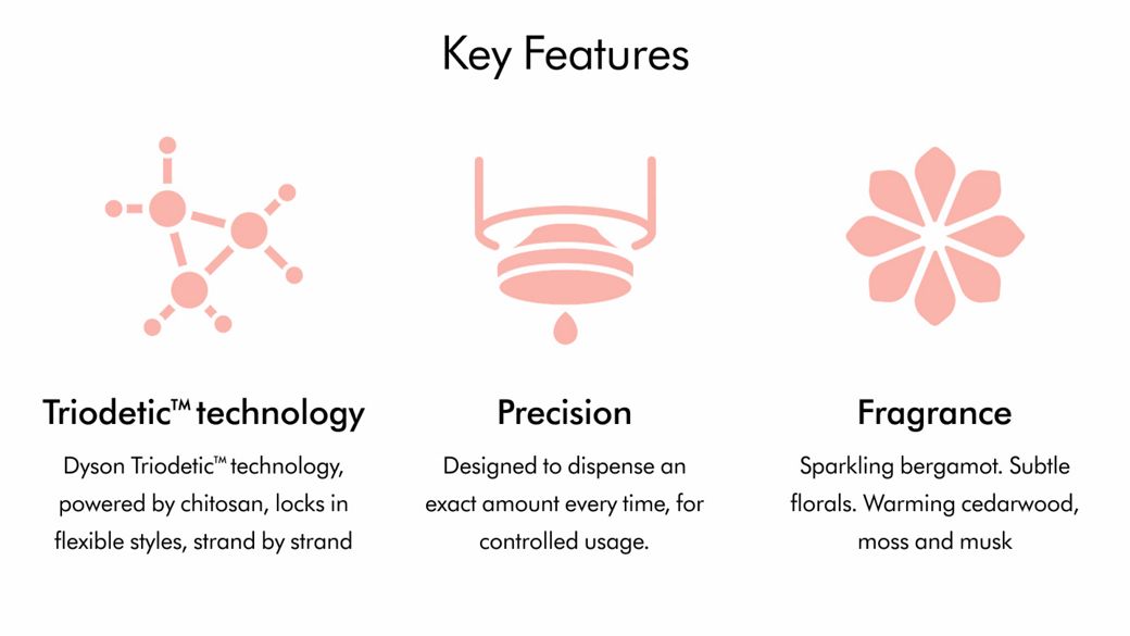 Dyson Triodetic™ technology, powered by our key ingredient, chitosan, creates flexible, lightweight bonds that support the hair, strand by strand – protecting your style from unwanted frizz, even in high humidity.2