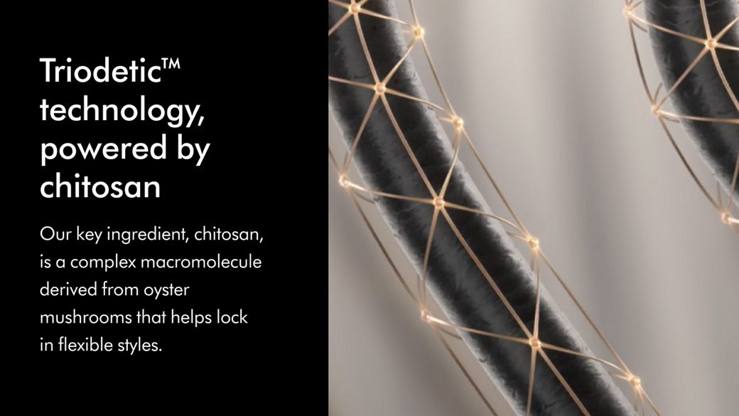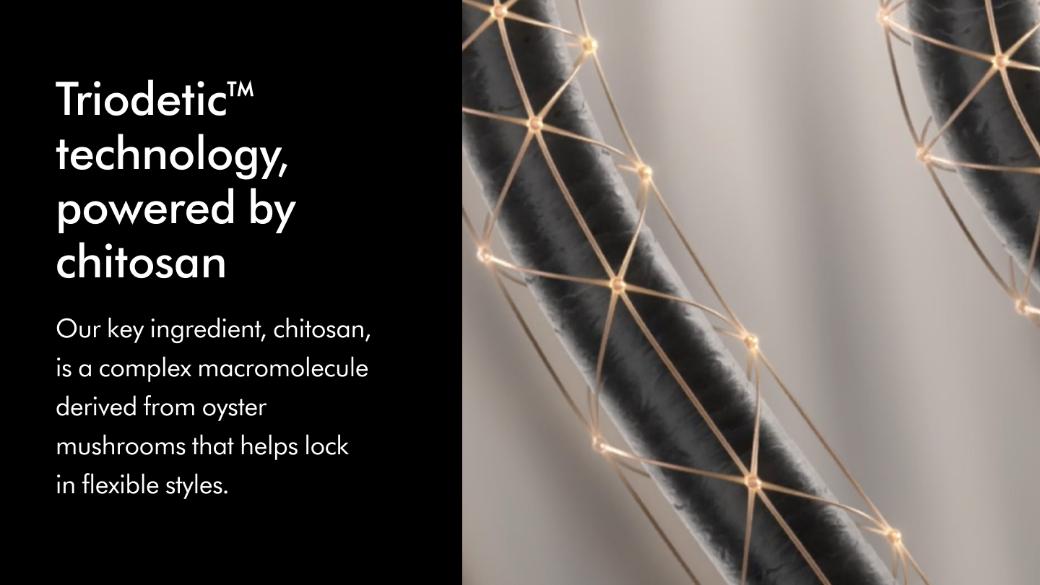 Chitosan is the hero ingredient in our Dyson Chitosan™ hair styling range. Chitosan is a complex macromolecule derived from oyster mushrooms. This complex macromolecule helps create flexible bonds that support hair strand by strand, for flexible all-day hold.1 It’s the foundation of our Dyson Triodetic™ technology. Our key ingredient is also supported by oils, to help condition the hair surface, reducing frizz and giving a soft, shiny finish.