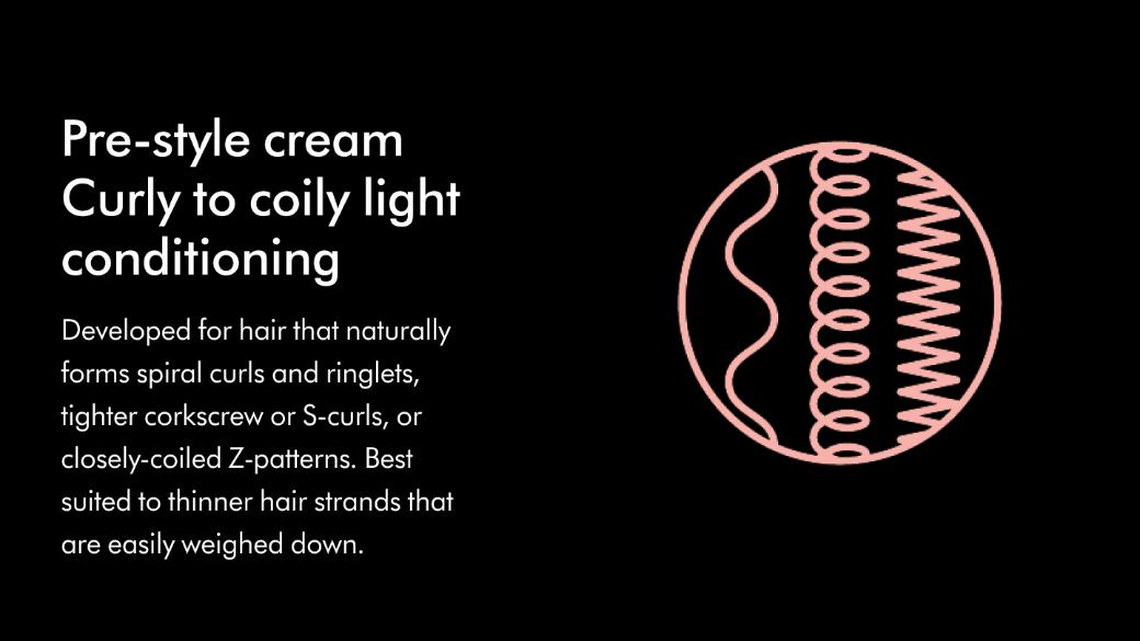 First, determine your hair shape. Our Pre-style cream is tailored to two groups of hair shapes: straight to wavy, and curly to coily. To find which applies to you, imagine your hair has been washed and left to air-dry. What shape do the majority of the strands take?