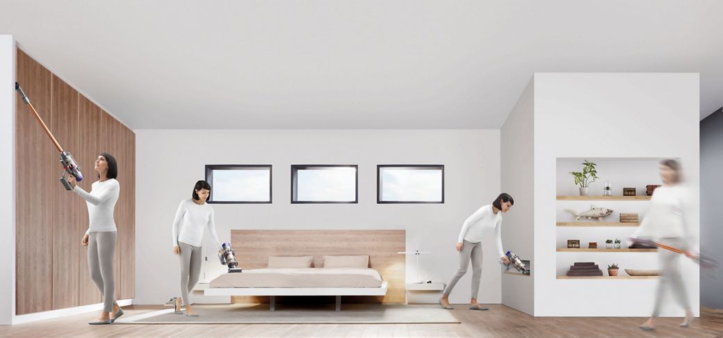 The Dyson Cyclone V10™ vacuum drops into the wall-mounted dock, to recharge it and tidily store tools. So it’s ready to grab and go.