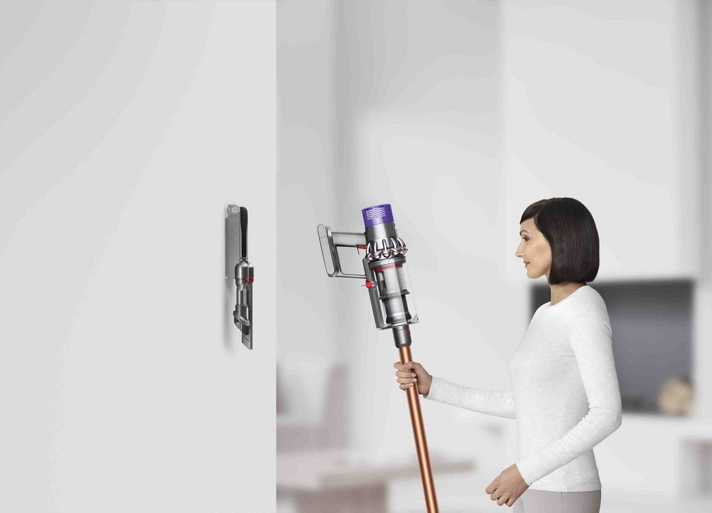 The Dyson Cyclone V10™ vacuum drops into the wall-mounted dock, to recharge it and tidily store tools. So it’s ready to grab and go.