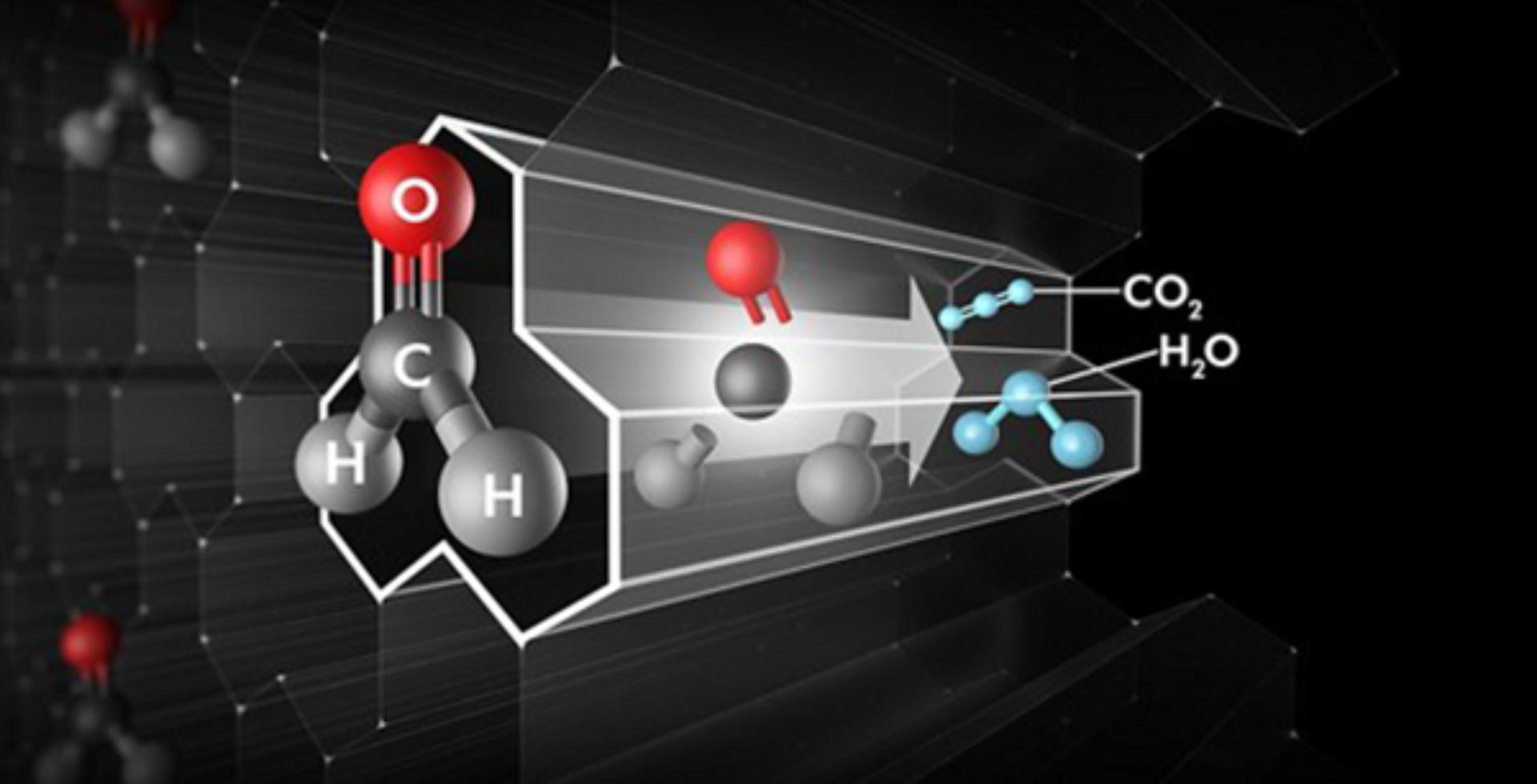 Dyson’s Selective Catalytic Oxidisation (SCO) filter continuously destroys formaldehyde at a molecular level.7 The catalytic filter has a unique coating, with the same structure as the Cryptomelane mineral. Its billions of atom-sized tunnels are the optimal size and shape to trap and destroy formaldehyde, breaking it down into tiny amounts of water and CO2. It then regenerates from oxygen in the air to keep destroying it continuously without ever requiring replacement.