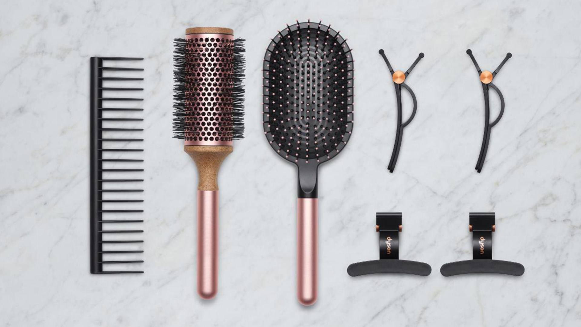 The Dyson Styling gift set in Rosé is designed to elevate at-home hair styling with a collection of ergonomically engineered brushes, comb and clips. Boxed in a sleek presentation case, this set includes 1 x Detangling comb, 1 x Paddle brush, 1 x Vented barrel brush, and 4 x Dyson hair clips to securely gather and section the hair. The perfect accessory set to any styling routine.