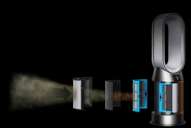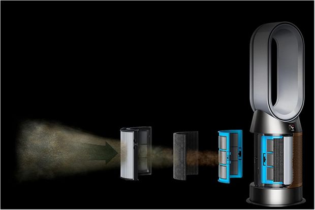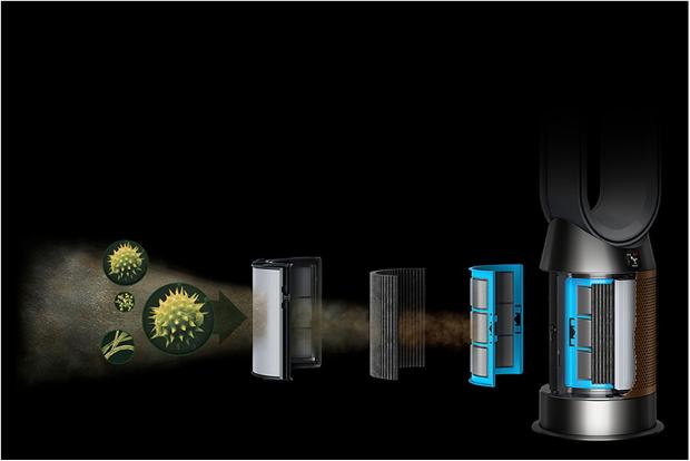 How Dyson purifiers capture particles Air circulation draws pollutants into the whole-machine filter. From there, 360 HEPA filtration captures tiny particles the size of 0.1 microns3, and an activated carbon filter removes gases. Through different filters, different-sized pollutants are trapped and destroyed.